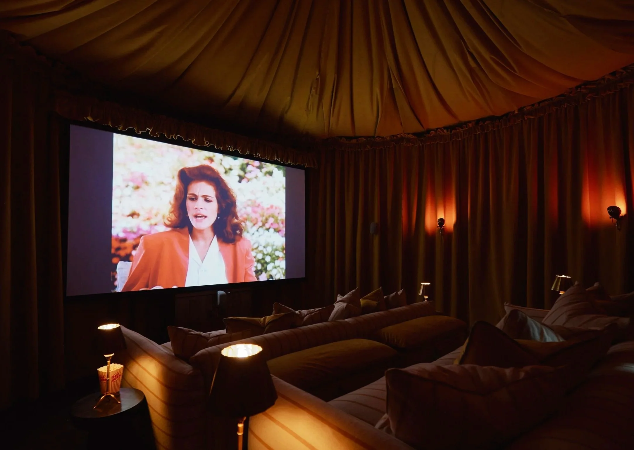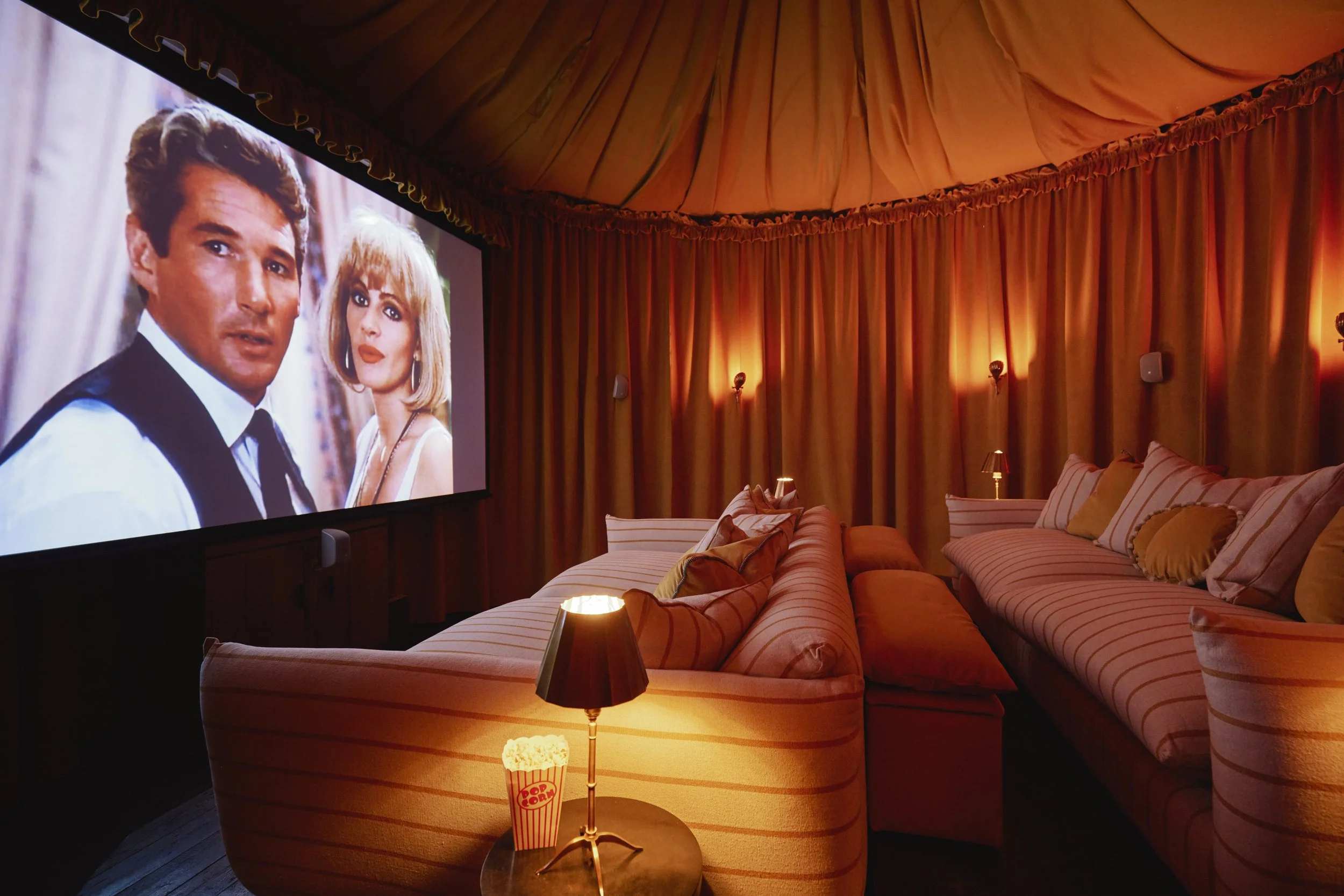 Wrapped entirely in mustard yellow curtains, the space is designed for switching off properly. A large projector runs via Apple TV, so you can stream whatever you’re in the mood for, films, series, or comfort re-watches. Sweet bags are provided, because what’s a cinema trip without snacks.